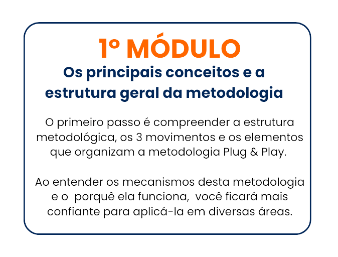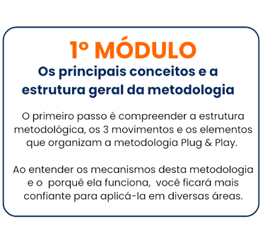 Neste curso você aprende a aplicar a Metodologia Plug & Play em qualquer área e pode utilizá-la, imediatamente, após o curso.